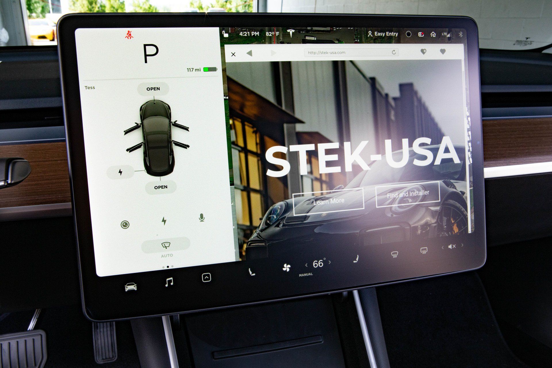 The center console on the Model 3 is a whole other issue. Its simple yet elegant design just screams modern and functional. The piano black finish, however, can be quite cumbersome to maintain. For this, we install STEK paint protection film. You can keep the gloss finish and have a self-healing finish or we can swap it out for a more toned down matte finish which makes fingerprints and smudges much less visible. If you prefer a high-performance look we also offer carbon fiber finishes for that sporty touch and feeling. Whichever style you choose, you will definitely appreciate the clean and easy to maintain film on your console.
